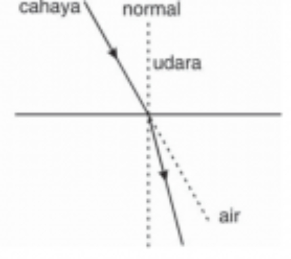 Pada gambar di atas, cahaya yang datang dari udara (zat kurang rapat) ke air (zat yang lebih rapat), maka cahaya dibiaskan mendekati garis normal.