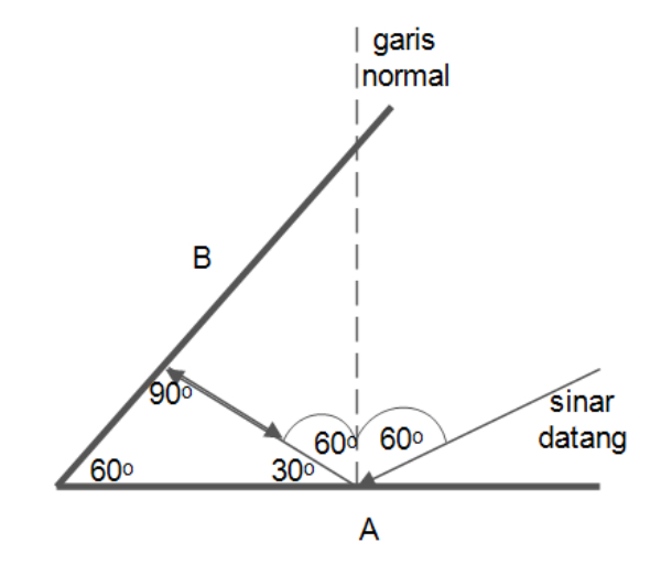 Sinar pantul pada cermin A menjadi sinar datang pada cermin B. Sinar datang pada cermin B jatuh tegak lurus (membentuk sudut 90o).