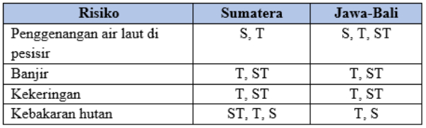 Risiko-risiko yang mungkin dialami oleh dua pulau tersebut, Sumatera dan Jawa, merupakan dampak dari perubahan iklim. Pernyataan yang tidak tepat untuk menjelaskan data pada tabel di atas adalah ....
