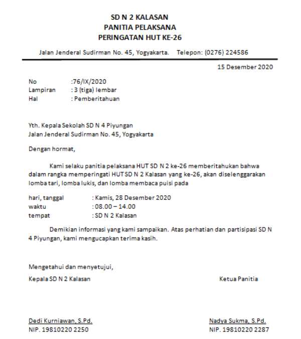 Kepala surat (kop surat) diisi dengan nama lembaga/organisasi yang mengirimkan surat. Untuk bisa mengisi bagian kepala surat di atas, kita harus memahami isi surat dan tujuannya terlebih dahulu.